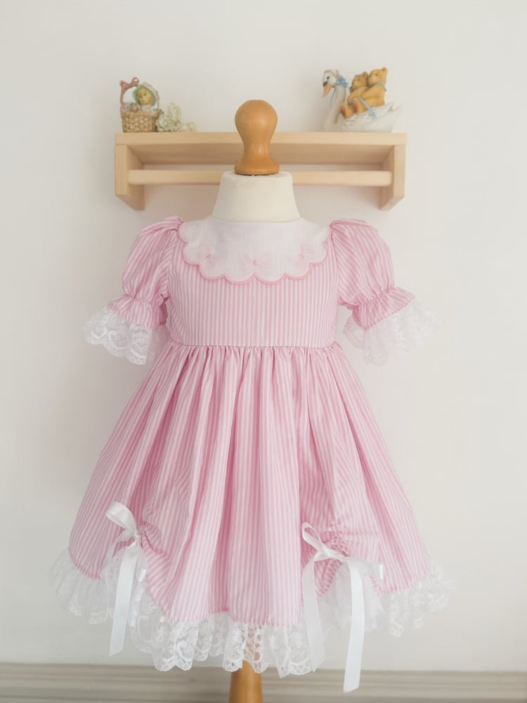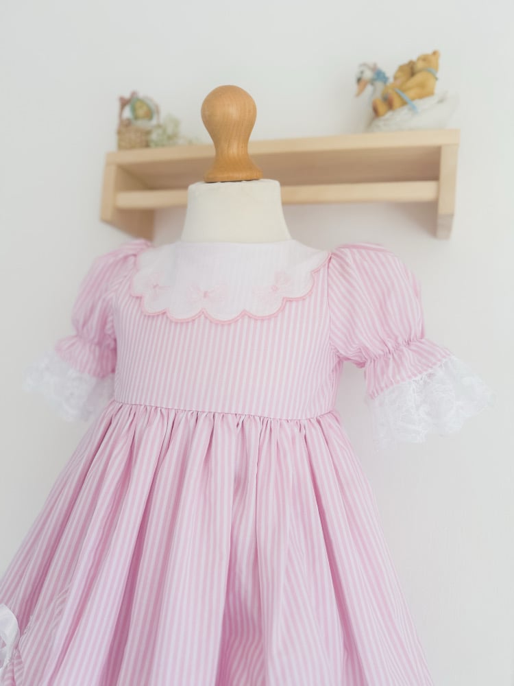 Crafted in a delicate pink-and-white stripe, this timeless design features puffed sleeves trimmed with soft lace, a scalloped embroidered collar, and a full gathered skirt finished with sweet satin bows. The hemline is adorned with lace for an extra touch of elegance, perfect for twirling and celebrating in style 🎀